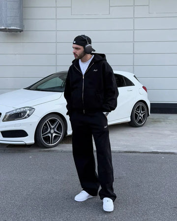 Dicker Premium-Stoff, hochwertige Metall-Details (Reißverschluss, Logos), verstärkte Nähte.
